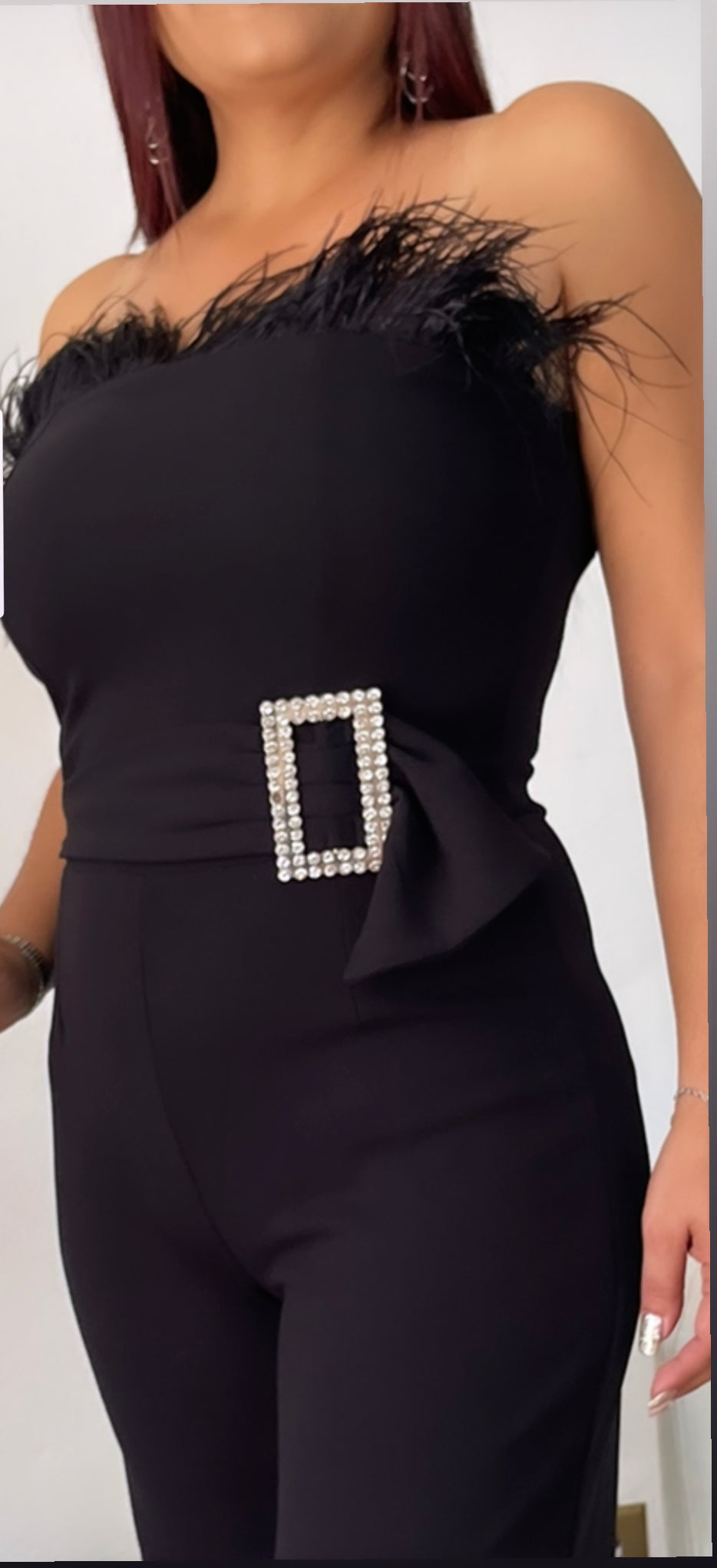 Hermoso Jumpsuit color negro con plumas en la parte superior al frente para un toque muy elegante y sofisticado.