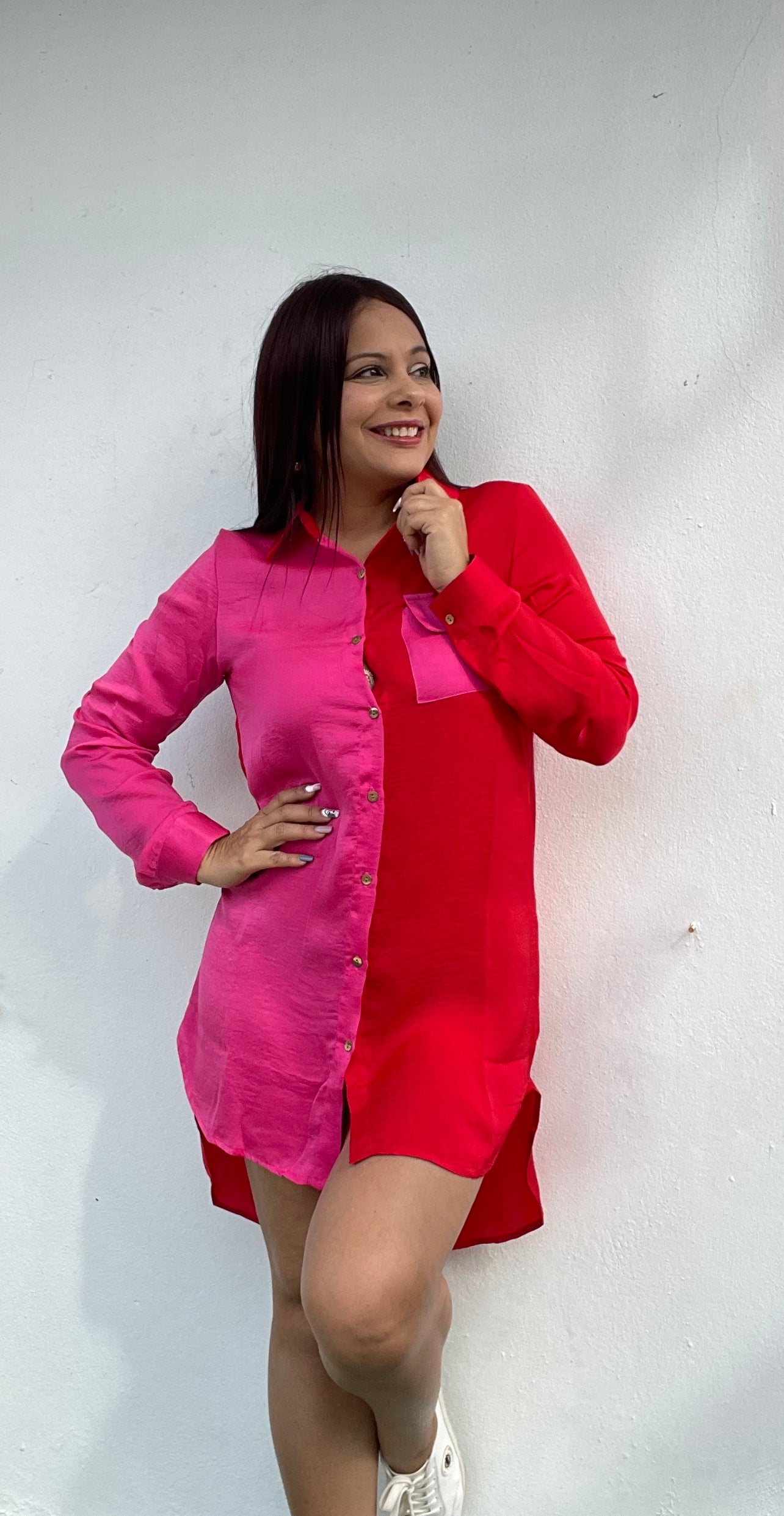 Una belleza en doble tono rojo y rosado. Tela satinada con bolsillos en el frente . Mangas ajustables.