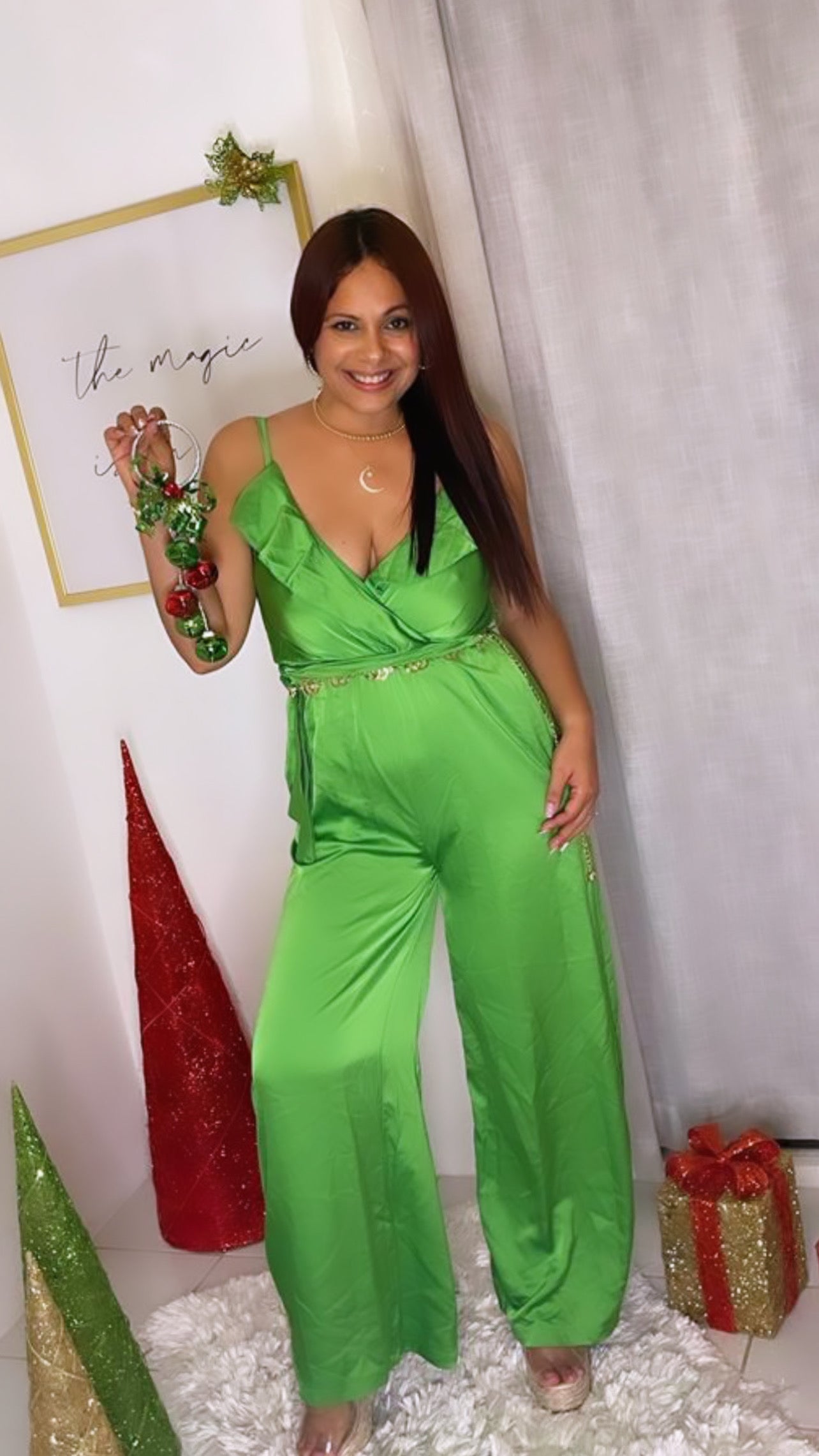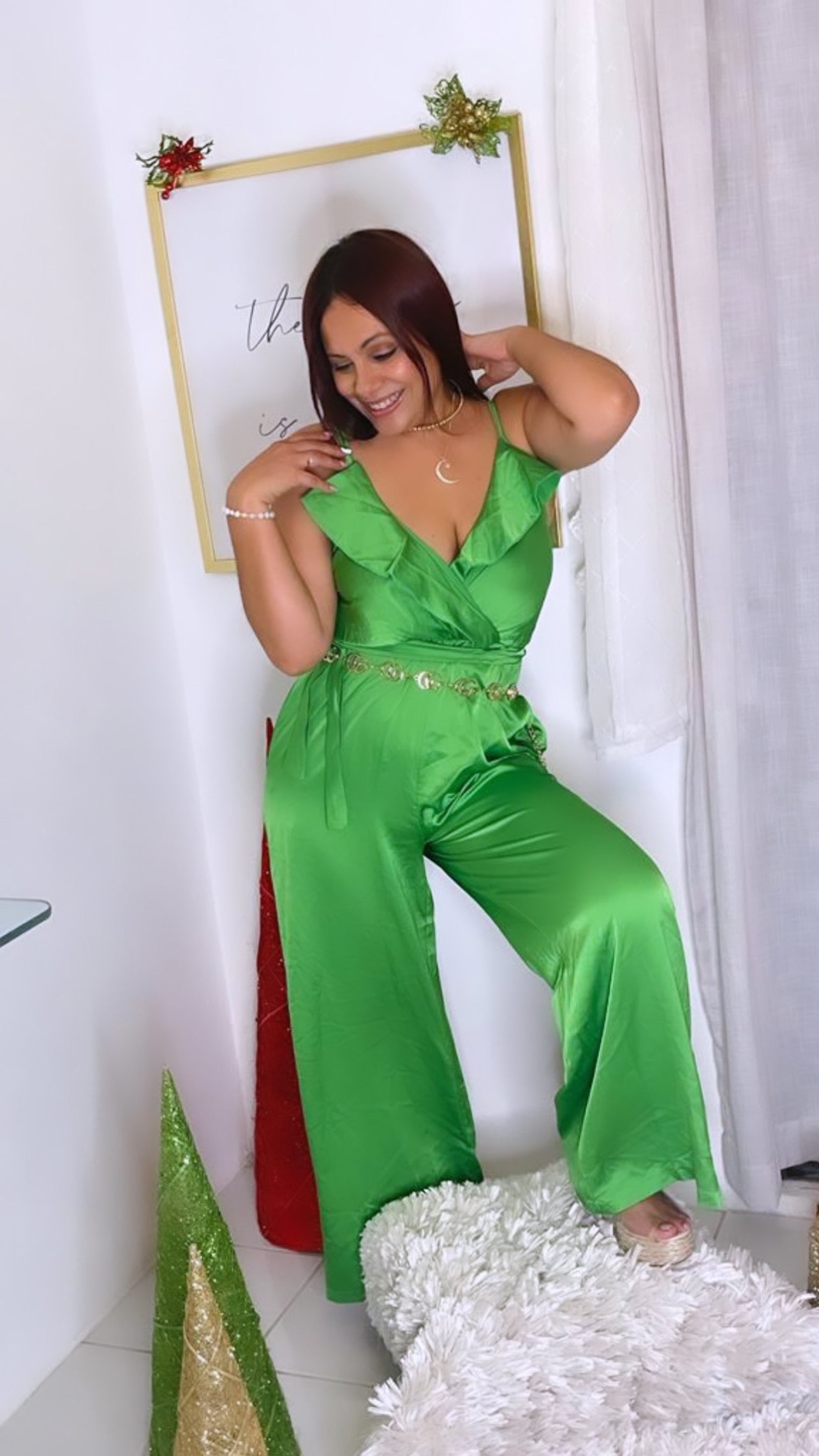 Hermoso Jumpsuit en el bello color verde esmeralda, perfecto para las temporadas Festivas que se acercan. Tela satin. Muy elegnte, comodo y fresco.