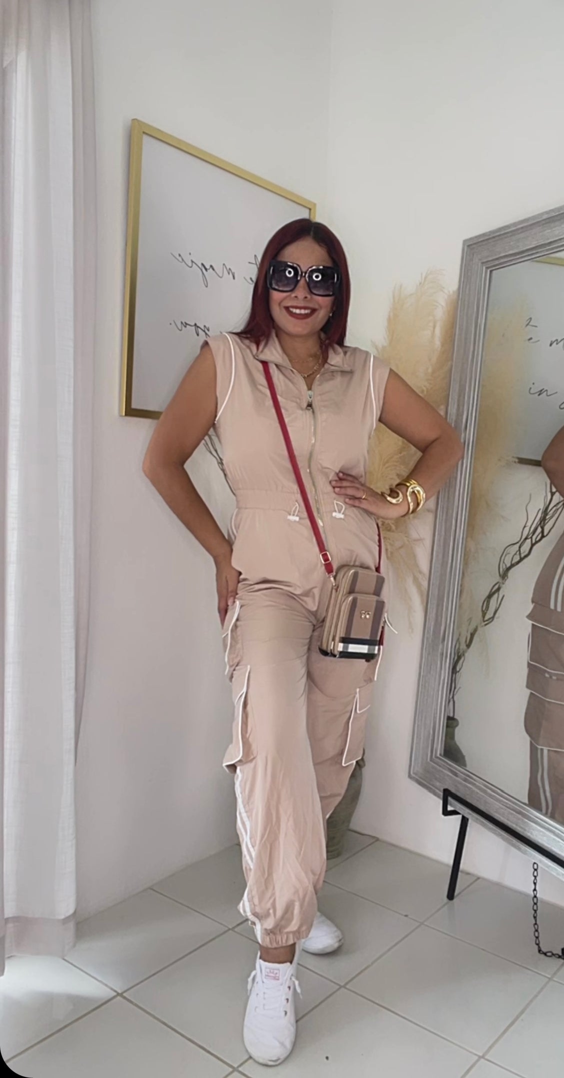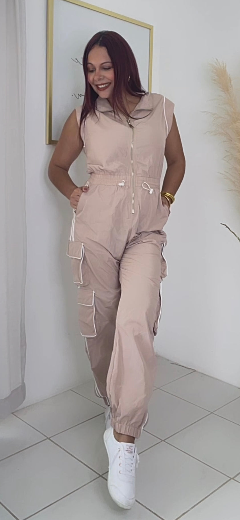 Bello Jumpsuit en color beige y blanco. Tiene zipper y bolsilos en ambas piernas funcionales. Muy comodo y fresco.