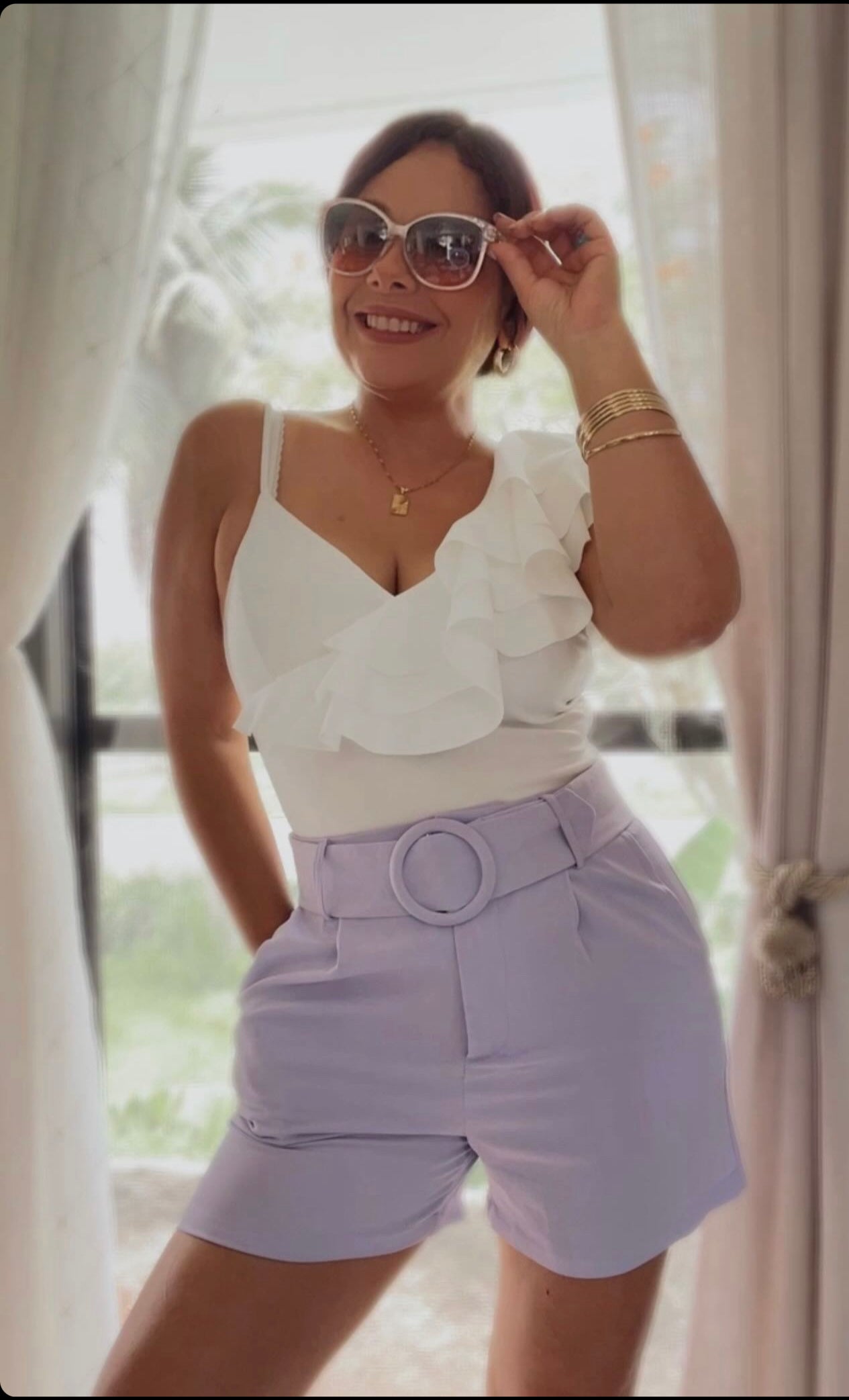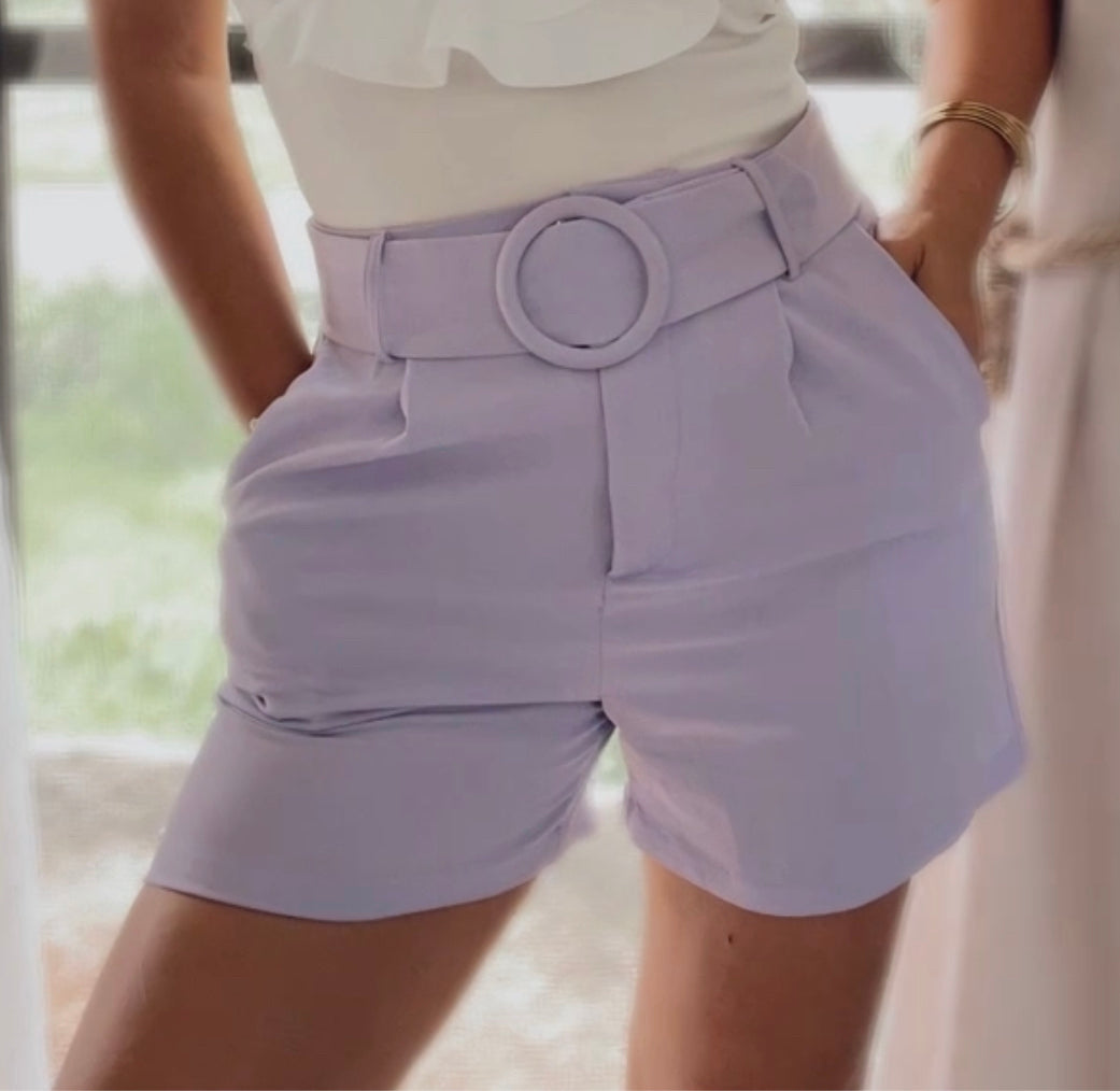 Bello short en el hermoso color lavanda. Alto en la cintura y incluye la correa en la misma tela. Corre tamano regular. Tela polyester con un poco de spandex. Top se vende por separado.