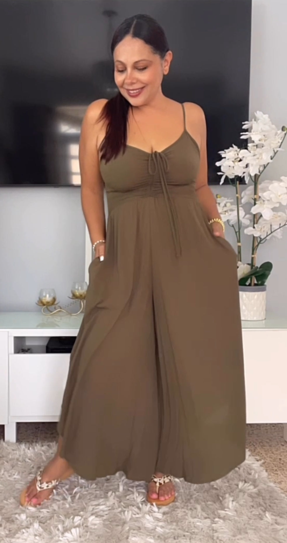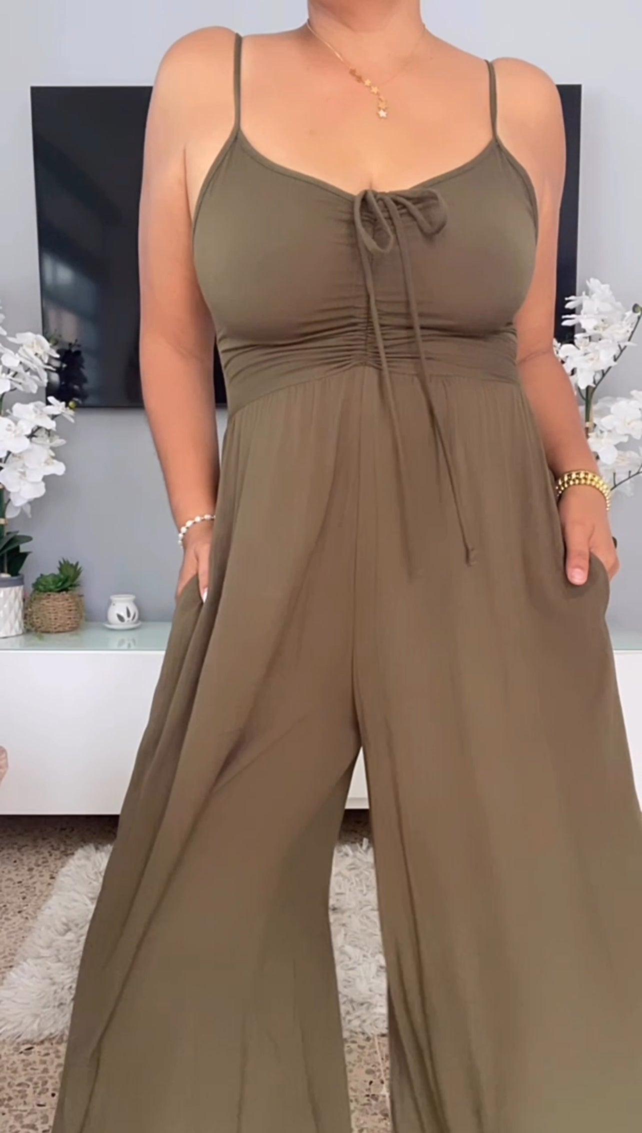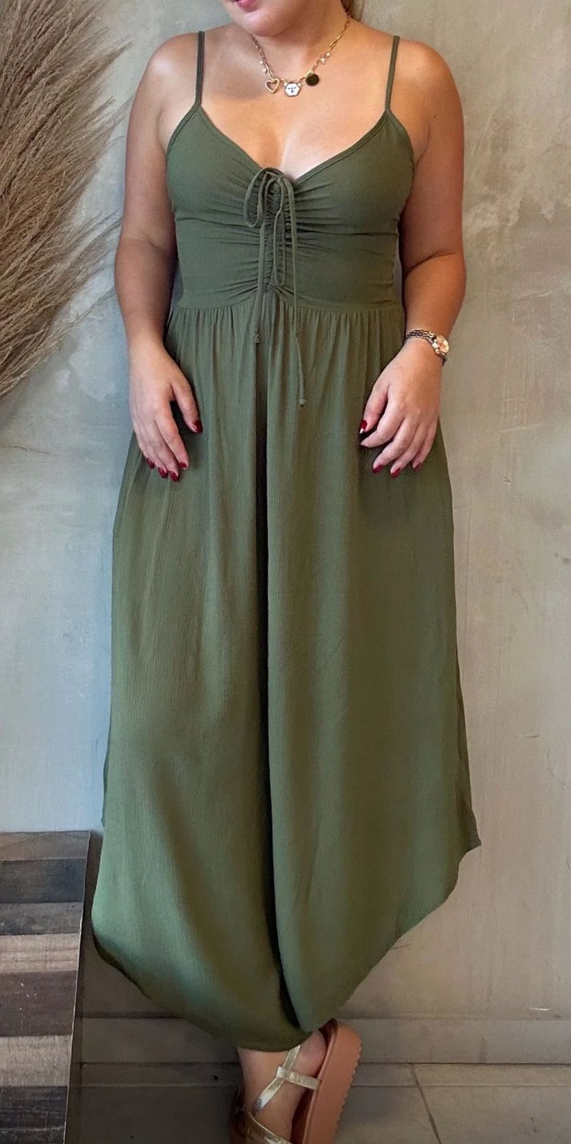 Jumpsuit Color verde Oliva tipo palazzo asimetrico