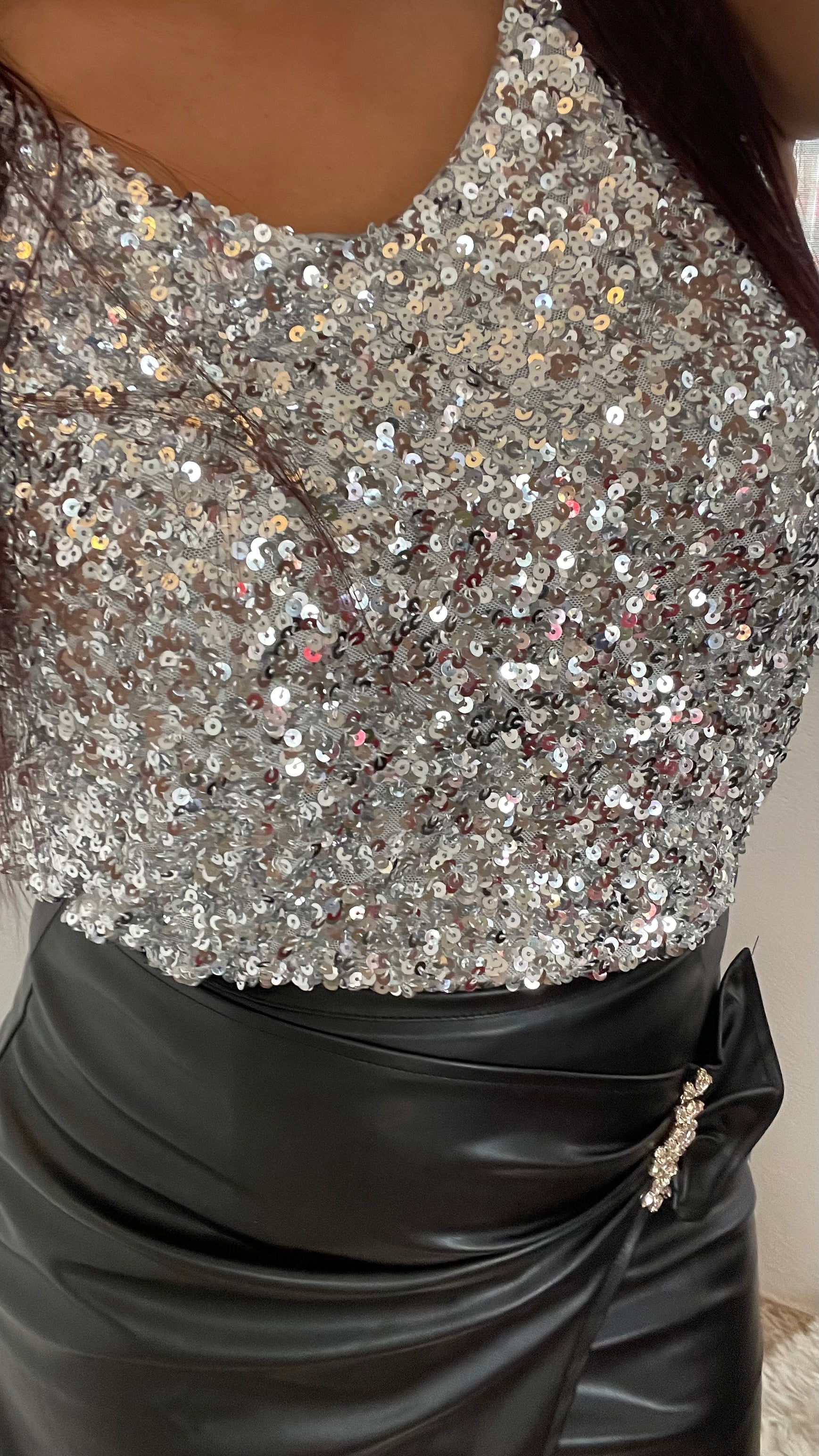 Preciosa blusa en lentejuelas color plateada. Manguillos ajustables. Forrada por dentro.