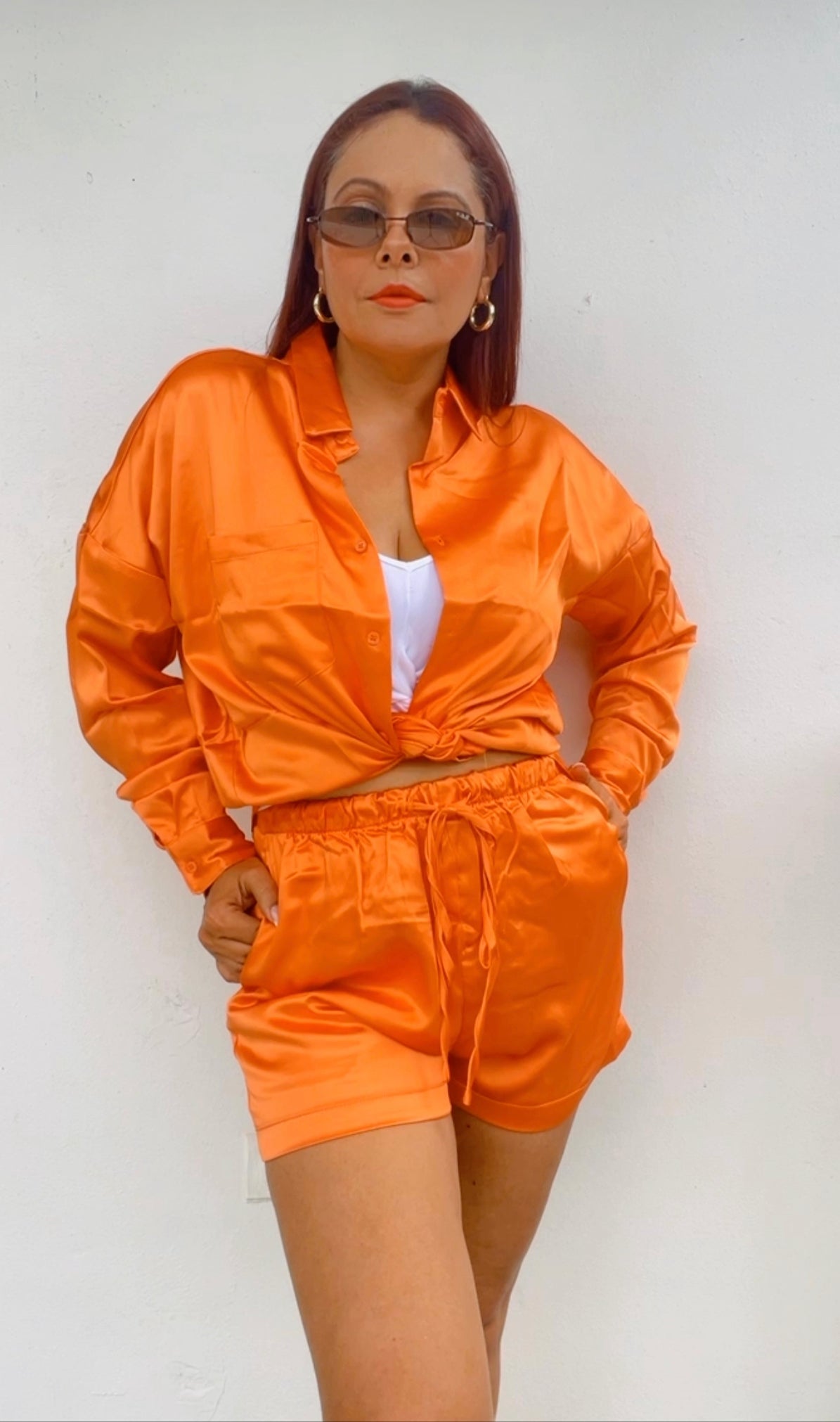 Tela satin, camisa de botones y pantalon en cintura tiene elastico.