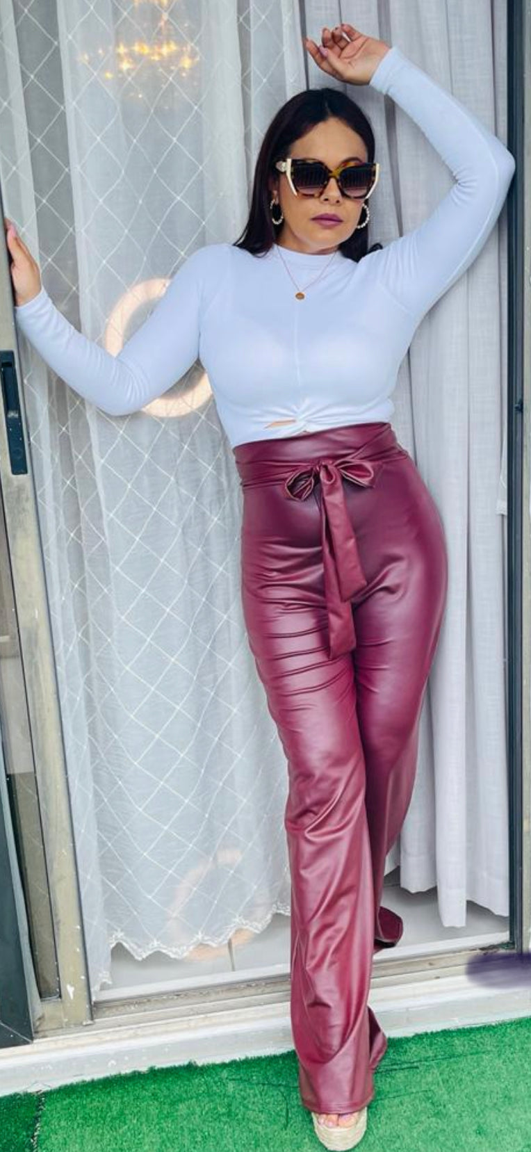 Elegante y fino leather pants en el bello color vino navideno. Queda alto en la cintura e Incluye banda en la cintura dando un toque coqueto.